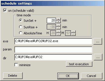 - test execution : ボタンを押すと即時に設定内容に従って指定プログラムを起動します。