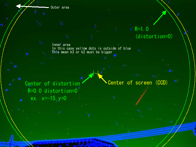 - Set Center offset x,y to get the state that yellow and blue have same relation around the distortion center (green cross mark).