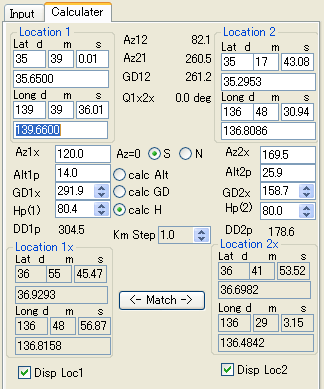 - ->Calc1,2 ボタンを押すと、Calculater(方位電卓)のLocation1,2へデータを受け渡すことができます。