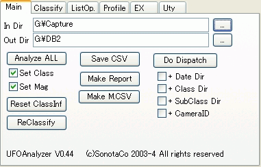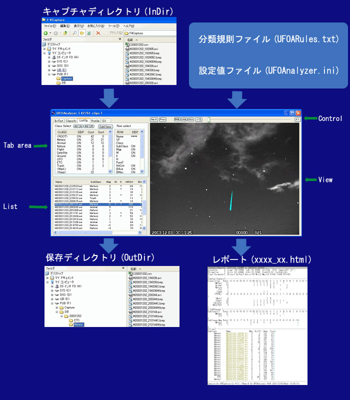 UFOAnalyzerは次のように、キャプチャディレクトリを読み込んで、必要クリップを選択し保存ディレクトリに分類して格納します。
