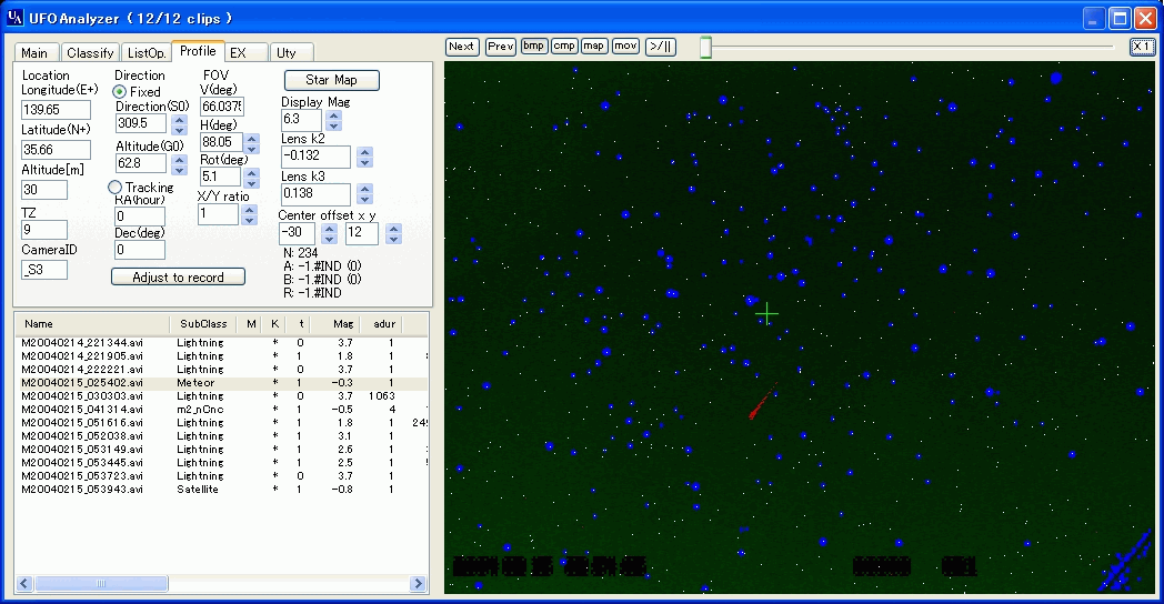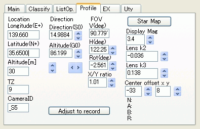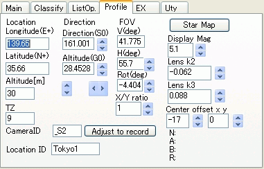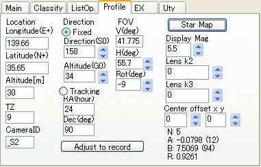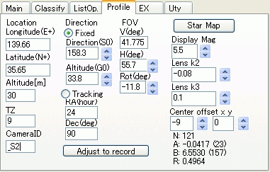 読み込みが終了したら、Profileタブでカメラプロファイル設定をして下さい。前回とカメラの方位等が全く同じ場合には調整の必要はありませんが、星図を重畳表示してカメラの方位を確認することをお薦めします。